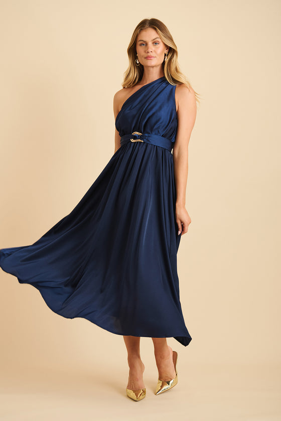 Bernadette One Shoulder Midi Dress In Navy Satin
