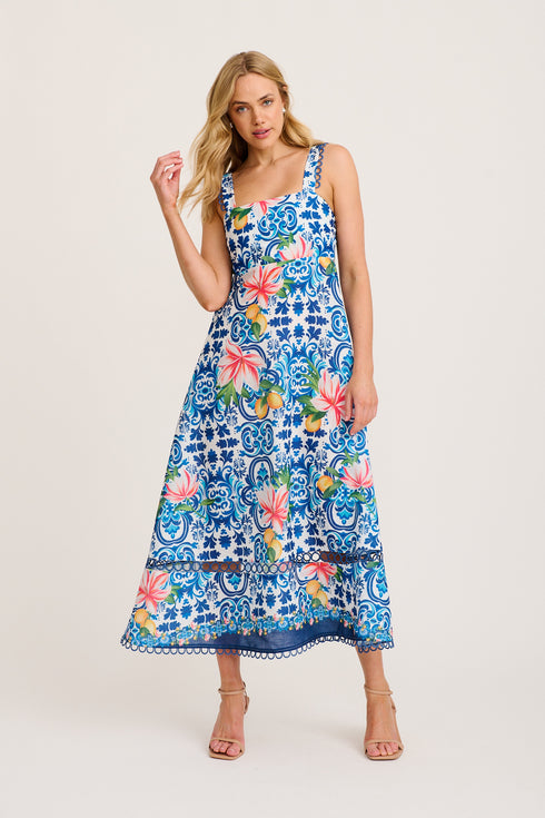Luxe Enchant Maxi Dress in Blue Multi Tiles Print Linen Blend