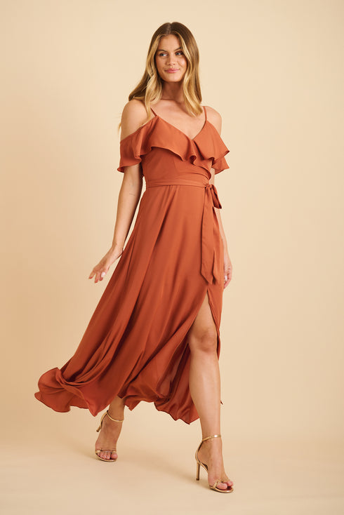 The Marit Maxi Dress in Rust is made for celebrations under the stars or by candlelight, your new go-to for weddings, bridesmaid parties, and all special occasions. This dress combines a soft, ruffled V-neckline with romantic off-shoulder sleeves and an adjustable shoulder strap for extra support. The fitted bodice flows into a floaty maxi skirt with a playful front split, making every step feel graceful and easy.