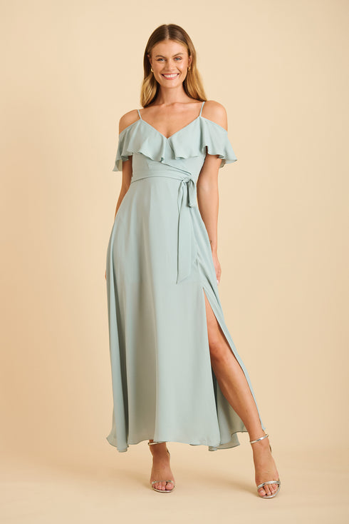 Bring a fresh, romantic energy to your next special event with the Marit Maxi Dress in Sage, a modern favourite for bridesmaids and wedding guests alike. This floaty dress features a ruffled V-neckline, soft off-shoulder sleeves, and a delicate adjustable shoulder strap for comfort and support. The tailored bodice and waist tie flatter every silhouette, while the relaxed maxi skirt and playful front split make every step picture-perfect.